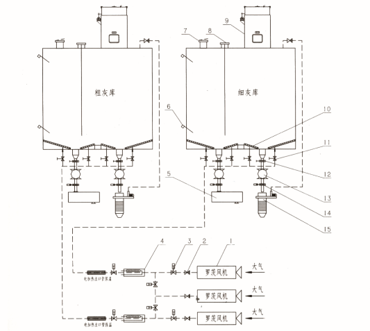 灰?guī)煜到y(tǒng)由灰?guī)毂倔w、灰?guī)鞖饣到y(tǒng)、卸料系統(tǒng)、庫頂系統(tǒng)、料位計等組成,主要設備有: